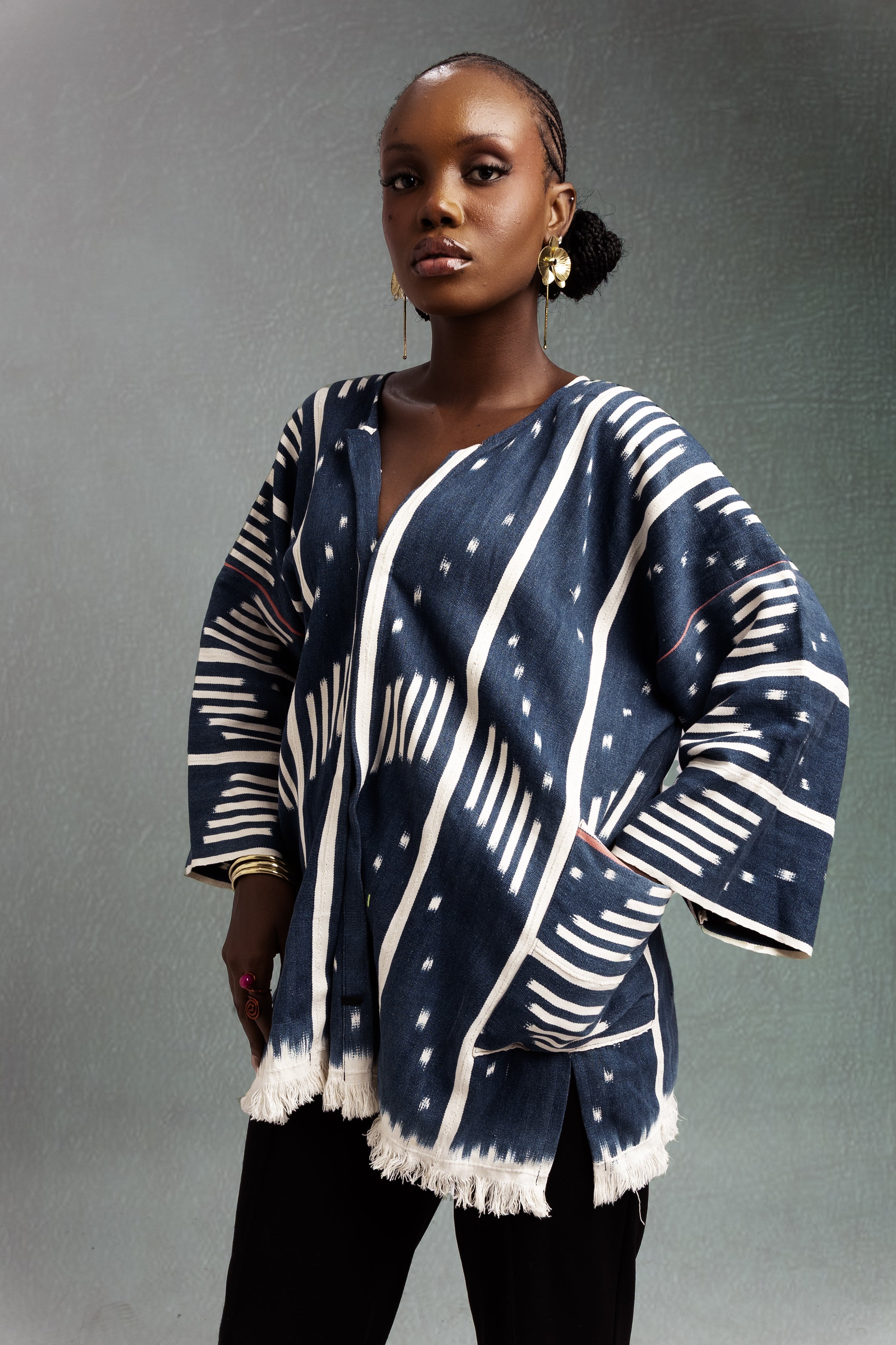Questo mantello è realizzato utilizzando Baulé della Costa d'Avorio e fa parte della nostra collezione di pezzi progressisti provenienti da fonti e prodotti sostenibili. Fatto a mano in Ghana da artigiani ghanesi, appositamente per te.